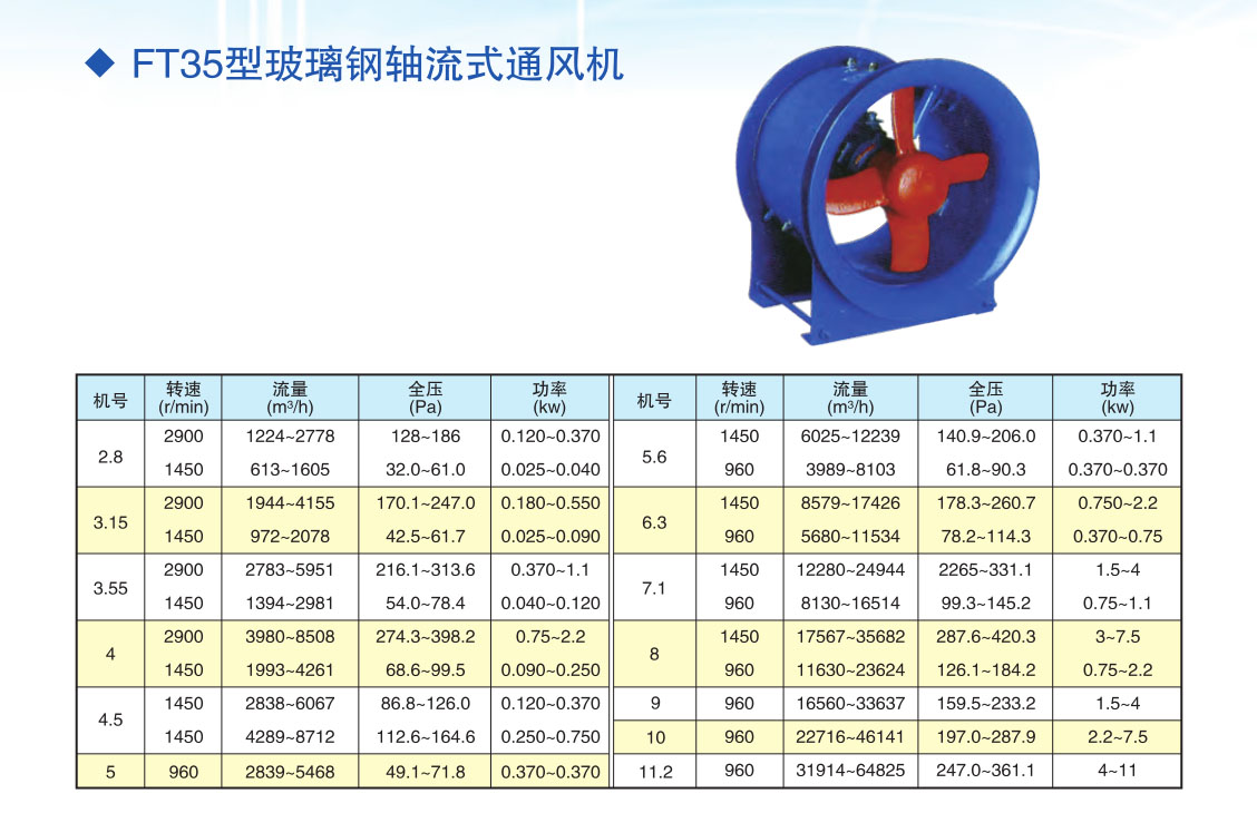 FZ40、35-11、FZ40-12(S)、FZ35-12(S)型軸流通風機特征:玻璃鋼軸流風機適用于輸送非易燃易爆無腐蝕無顯著粉塵的氣體,環(huán)境溫度不超過60℃。